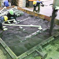 溶けた鉄を流し込む作業です。鋳物メーカーの見せ場です。